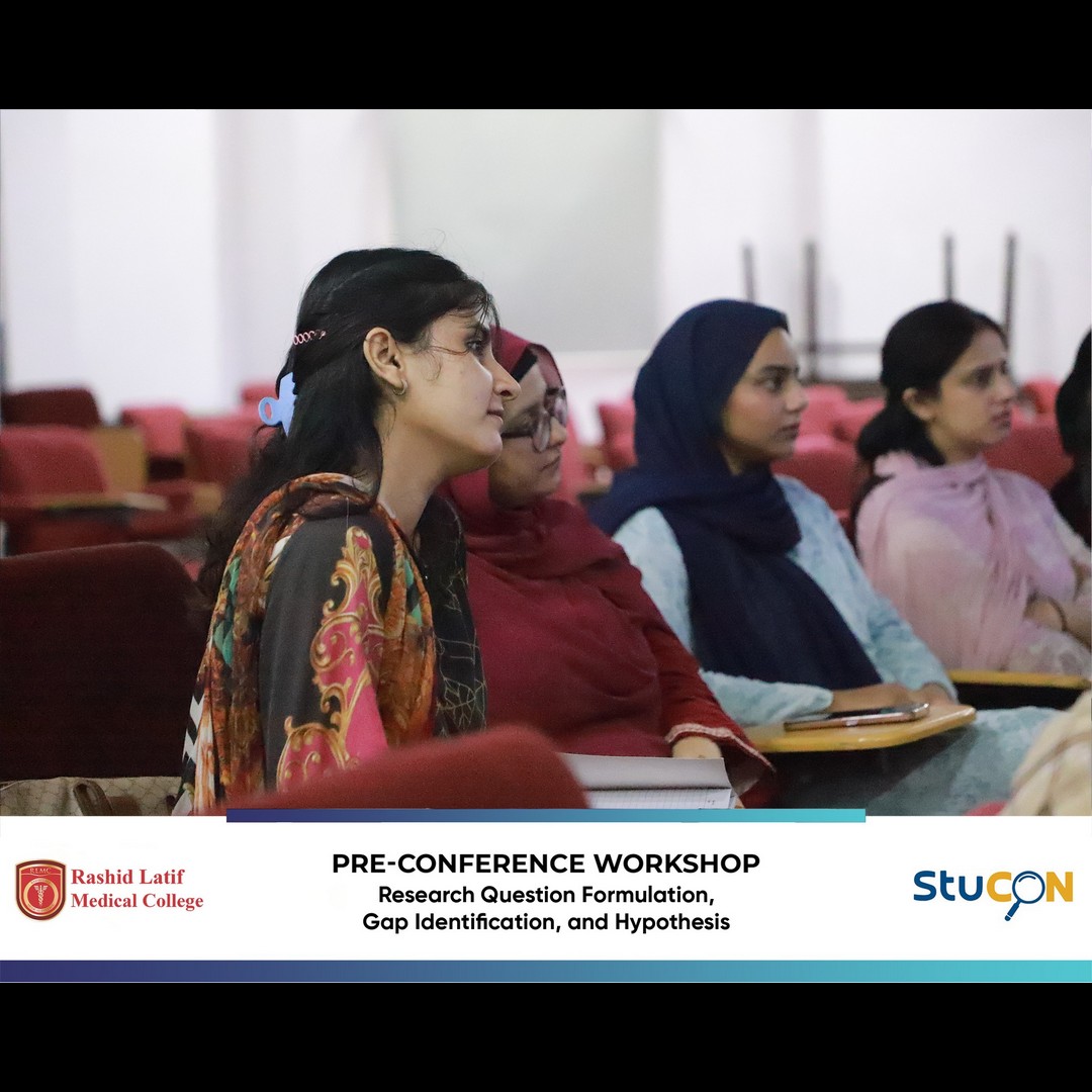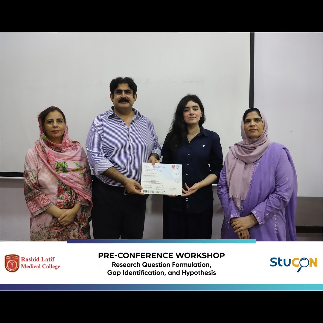 The pre-conference workshop on Research Question Formulation, Gap Identification, and Hypothesis was held on August 12, 2025, as part of the 2nd International StuCon. Dr. Syma Arshad, Associate Professor, Department of Community Medicine & Public Health, RLMC, conducted the session and shared her expertise with the participants. The workshop provided medical students with valuable knowledge and practical skills that were essential for designing impactful research projects. Participants learned methods to formulate precise research questions, identify gaps in existing literature, and develop well-structured hypotheses. The event was well received and was considered highly successful by the attendees. The workshop was efficiently organized through the combined efforts of the Research Cell and the organizing team, under the supervision of Prof. Tazeem Shahbaz, with special recognition to Dr. Neelam Rasheed (Associate Professor) and Dr. Ania Humayun (Demonstrator) for their coordination and dedicated support, which ensured the smooth execution and overall success of the event.